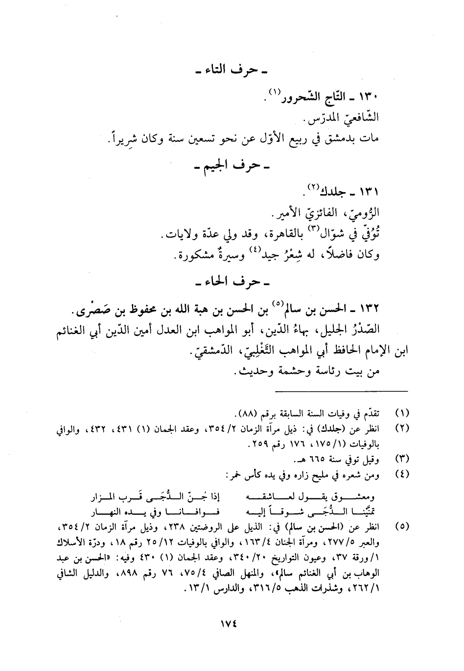 [2] انظر عن (جلدك) في: ذيل مرآة الزمان 2/ 354، وعقد الجمان (1) 431، 432، والوافي بالوفيات 1/ 175، 176 رقم 259.