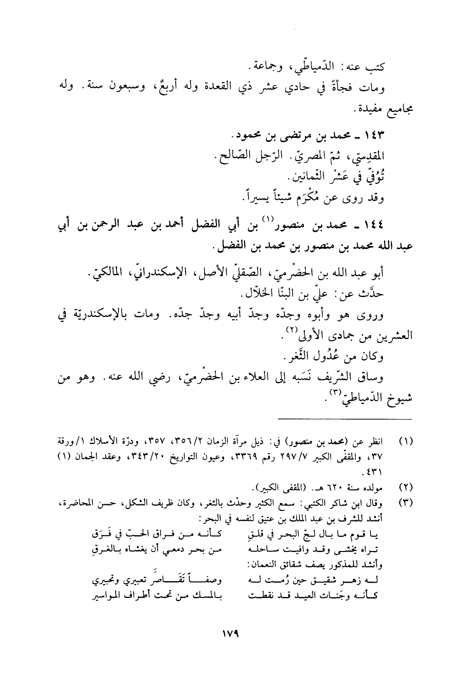 [1] انظر عن (محمد بن منصور) في: ذيل مرآة الزمان 2/ 356، 357، ودرّة الأسلاك 1/ ورقة 37، والمقفّى الكبير 7/ 297 رقم 3369، وعيون التواريخ 20/ 343، وعقد الجمان (1) 431.
