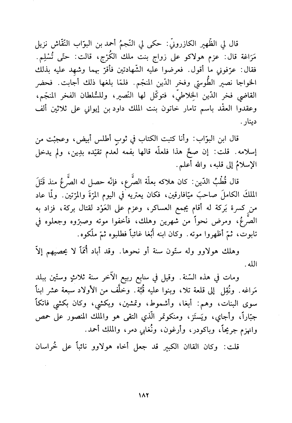 قال لي الظّهير الكازرونيّ: حكى لي النَّجم أحمد بن البوّاب النّقّاش نزيل مَرَاغة قال: عزم هولاكو على زواج بنت ملك الكُرْج، قالت: حتّى تُسْلِم.