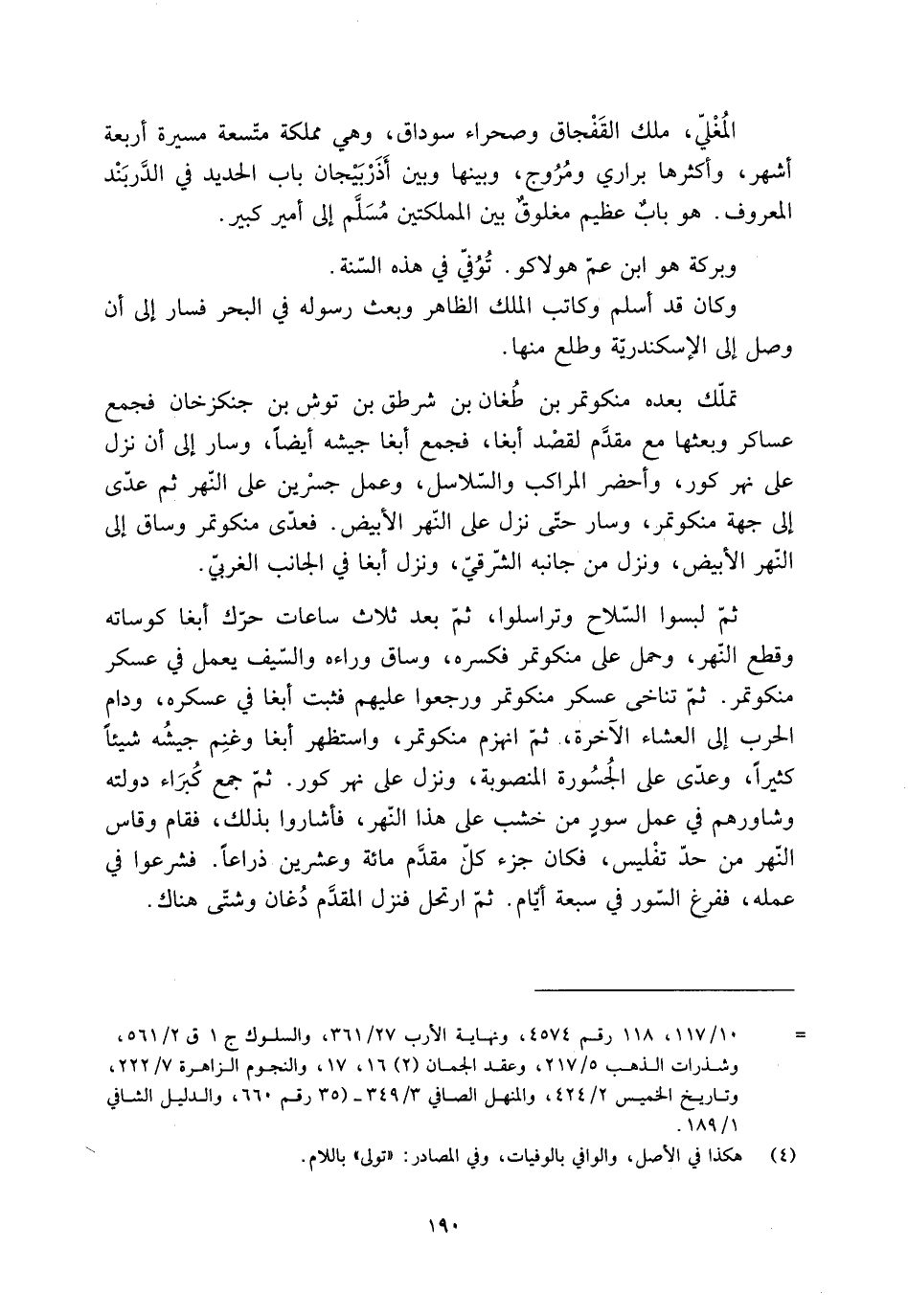 ثمّ لبسوا السّلاح وتراسلوا، ثمّ بعد ثلاث ساعات حرّك أبغا كوساته وقطع النّهر، وحمل على منكوتمر فكسره، وساق وراءه والسّيف يعمل في عسكر منكوتمر. ثمّ تناخى عسكر منكوتمر ورجعوا عليهم فثبت أبغا في عسكره، ودام الحرب إلى العشاء الآخرة، ثمّ انهزم منكوتمر، واستظهر أبغا وغنِم جيشُه شيئا كثيرا، وعدّى على الْجُسُورة المنصوبة، ونزل على نهر كور. ثمّ جمع كُبَراء دولته وشاورهم في عمل سورٍ من خشب على هذا النّهر، فأشاروا بذلك، فقام وقاس النّهر من حدّ تفْليس، فكان جزء كلّ مقدَّم مائة وعشرين ذراعا. فشرعوا في عمله، ففرغ السُّور في سبعة أيّام. ثمّ ارتحل فنزل المقدَّم دُغان وشتّى هناك.