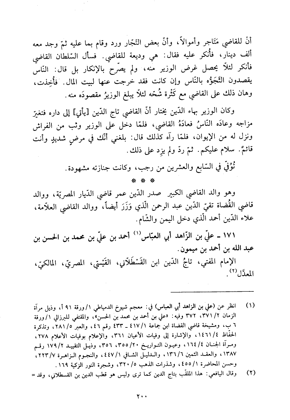 [1] انظر عن (علي بن الزاهد أبي العباس) في: معجم شيوخ الدمياطيّ 1/ ورقة 91 أ، وذيل مرآة الزمان 2/ 371، 372 وفيه: «علي بن أحمد بن محمد بن الحسن» ، والمقتفي للبرزالي 1/ ورقة 6 ب، ومشيخة قاضي القضاة ابن جماعة 1/ 417- 433 رقم 46، والعبر 5/ 281، وتذكرة الحفّاظ 4/ 1461، والإشارة إلى وفيات الأعيان 361، والإعلام بوفيات الأعلام 278، ومرآة الجنان 4/ 164، وعيون التواريخ 20/ 355، 356، وذيل التقييد 2/ 179 رقم 1387، والعقد الثمين 6/ 136، والدليل الشافي 1/ 447، والنجوم الزاهرة 7/ 223، وحسن المحاضرة 1/ 455، وشذرات الذهب 5/ 320، وشجرة النور الزكية 169.