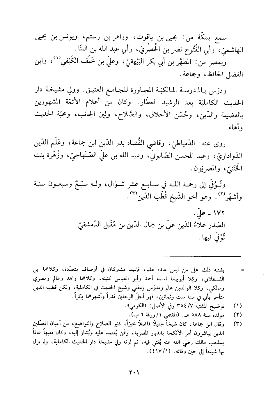 [ () ] يشتبه ذلك على من ليس عنده علم، فإنّهما مشتركان في أوصاف متعدّدة، وكلاهما ابن القسطلاني، وكلا أبويهما اسمه أحمد وأبو العباس كنيته، وكلاهما زاهد وعالم ومصري ومالكي، وكلا الوالدين عالم ومدرّس ومفتي وشيخ الحديث في الكاملية، ولكن قطب الدين متأخر يأتي في سنة ست وثمانين، فهو أجلّ الرجلين قدرا وأشهر هما ذكرا.