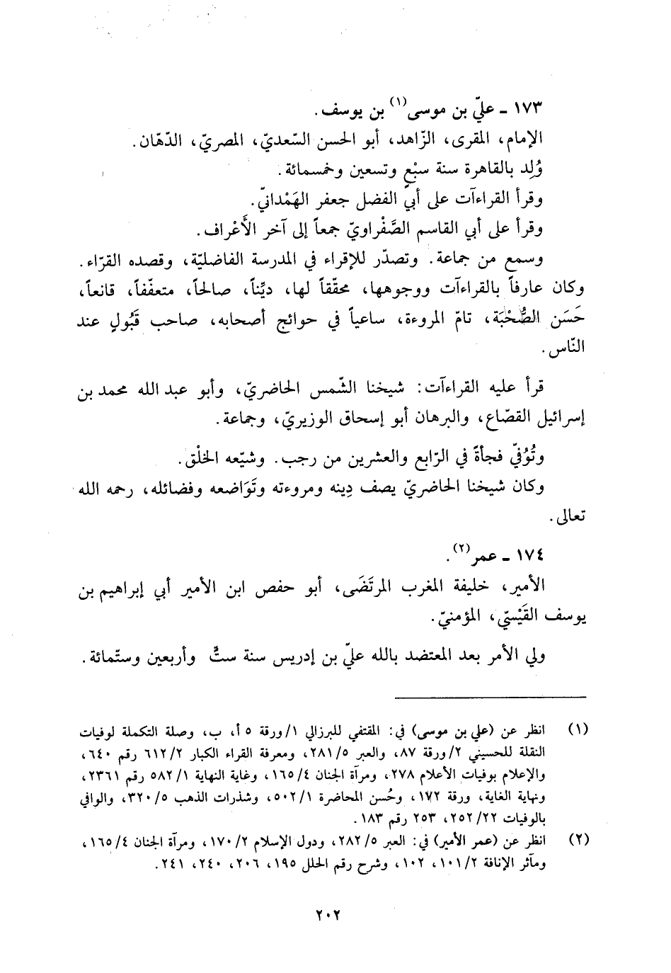 [1] انظر عن (علي بن موسى) في: المقتفي للبرزالي 1/ ورقة 5 أ، ب، وصلة التكملة لوفيات النقلة للحسيني 2/ ورقة 87، والعبر 5/ 281، ومعرفة القراء الكبار 2/ 612 رقم 640، والإعلام بوفيات الأعلام 278، ومرآة الجنان 4/ 165، وغاية النهاية 1/ 582 رقم 2361، ونهاية الغاية، ورقة 172، وحسن المحاضرة 1/ 502، وشذرات الذهب 5/ 320، والوافي بالوفيات 22/ 252، 253 رقم 183.