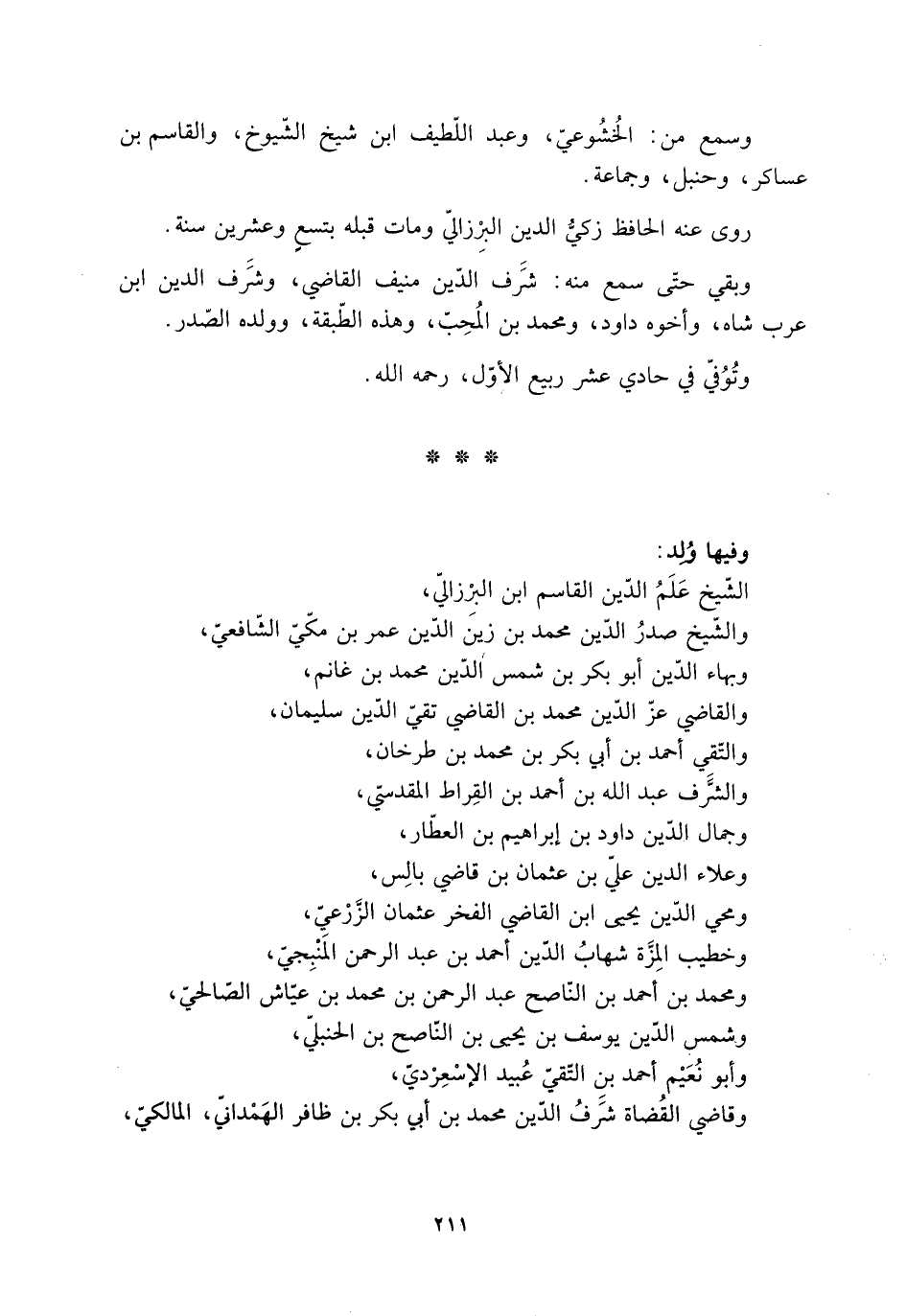 الشّيخ عَلَم الدّين القاسم ابن البِرْزاليّ، والشّيخ صدرُ الدّين محمد بن زَين الدّين عمر بن مكّيّ الشّافعيّ، وبهاء الدّين أبو بكر بن شمس الدّين محمد بن غانم، والقاضي عزّ الدّين محمد بن القاضي تقيّ الدّين سليمان، والتّقي أَحْمَد بْن أبي بَكْر بْن مُحَمَّد بْن طرخان، والشَّرَف عبد الله بن أحمد بن القِراط المقدِسيّ، وجمال الدّين داود بن إبراهيم بن العطّار، وعلاء الدين عليّ بن عثمان بن قاضي بالِس، ومحيي الدّين يحيى ابن القاضي الفخر عثمان الزَّرْعيّ، وخطيب المِزَّة شهابُ الدّين أحمد بن عبد الرحمن المَنْبِجيّ، ومحمد بن أحمد بن النّاصح عبد الرحمن بن محمد بن عيّاش الصّالحيّ، وشمسُ الدّين يوسف بن يحيى بن النّاصح بن الحنبليّ، وأبو نُعَيْم أحمد بْن التّقيّ عُبَيْد الإسعرديّ، وقاضي القُضاة شَرفُ الدّين محمد بن أبي بكر بن ظافر الهَمْدانيّ، المالكيّ،