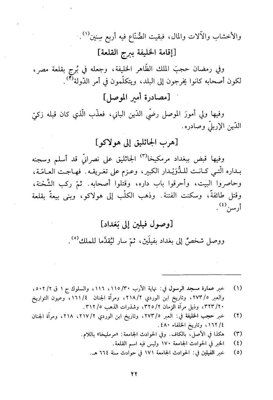 [5] خبر الفيلين في: الحوادث الجامعة 171 في حوادث سنة 664 هـ.
