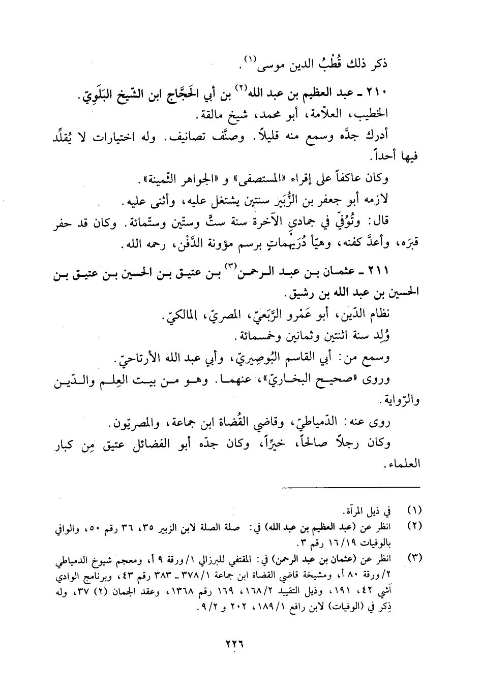 [3] انظر عن (عثمان بن عبد الرحمن) في: المقتفي للبرزالي 1/ ورقة 9 أ، ومعجم شيوخ الدمياطيّ 2/ ورقة 80 أ، ومشيخة قاضي القضاة ابن جماعة 1/ 378- 383 رقم 43، وبرنامج الوادي آشي 42، 191، وذيل التقييد 2/ 168، 169 رقم 1368، وعقد الجمان (2) 37، وله ذكر في (الوفيات) لابن رافع 1/ 189، 202 و 2/ 9.