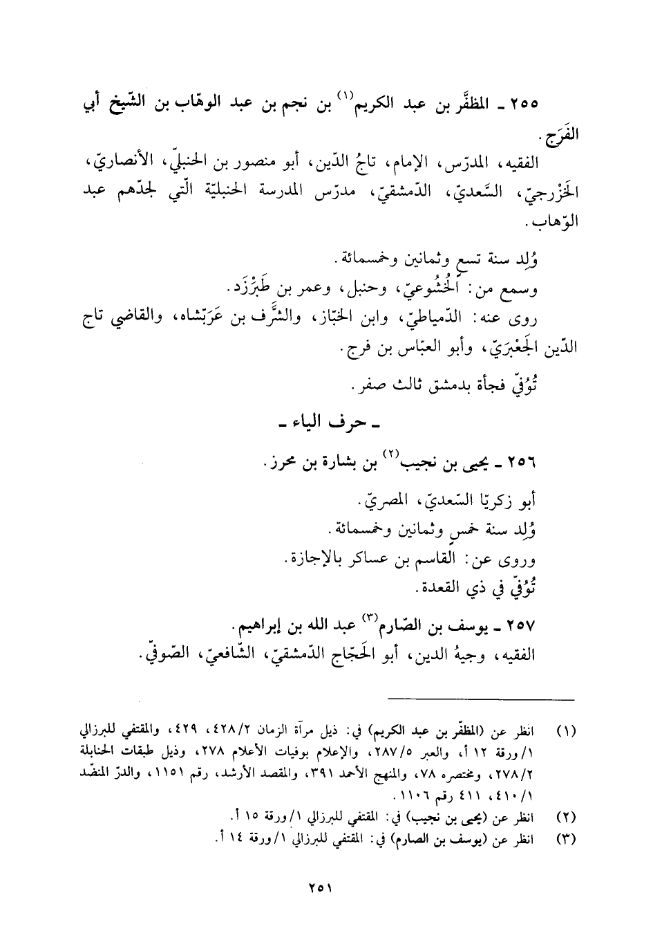 255- المظفَّر بن عبد الكريم [1] بن نجم بْن عَبْد الوهاب بْن الشَّيْخ أَبِي الفَرَج.