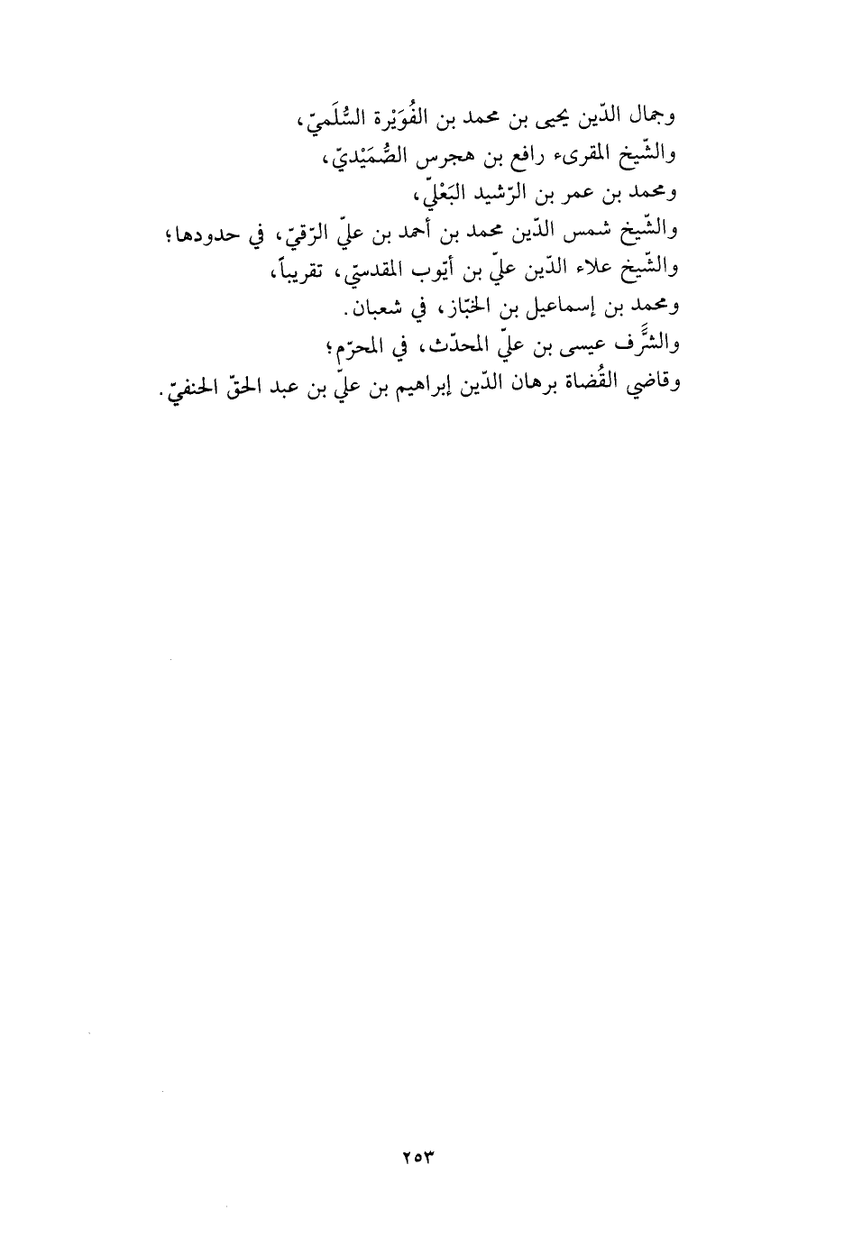 وجمال الدّين يحيى بن محمد بن الفُوَيْرة السُّلَميّ، والشّيخ المقرئ رافع بن هجرس الصُّمَيْديّ، ومحمد بن عمر بن الرّشيد البَعْليّ، والشّيخ شمس الدّين محمد بن أحمد بن عليّ الرّقيّ، في حدودها، والشّيخ علاء الدّين عليّ بن أيّوب المقدِسيّ، تقريبا، ومحمد بن إسماعيل بن الخبّاز، في شعبان.