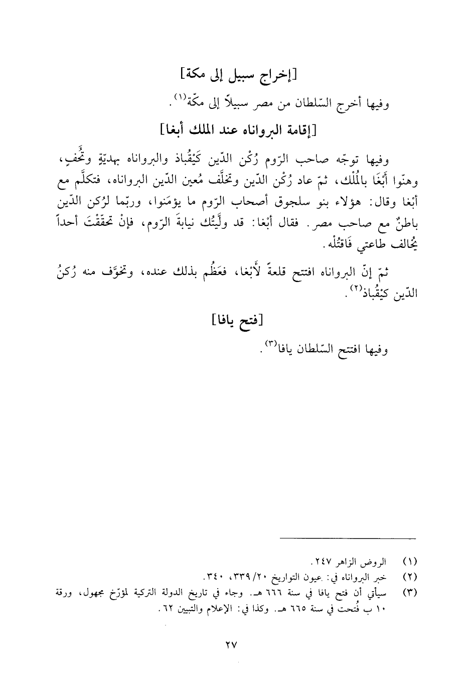 [3] سيأتي أن فتح يافا في سنة 666 هـ. وجاء في تاريخ الدولة التركية لمؤرّخ مجهول، ورقة 10 ب فتحت في سنة 665 هـ. وكذا في: الإعلام والتبيين 62.