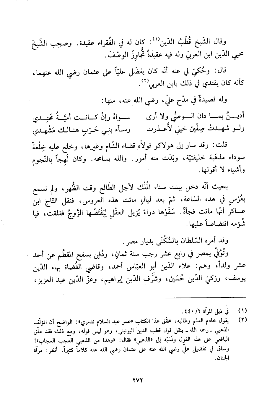 [2] يقول خادم العلم وطالبه، محقّق هذا الكتاب «عمر عبد السلام تدمري» : الواضح أن المؤلّف الذهبي- رحمه الله- ينقل قول قطب الدين اليونيني، وهو ليس قوله، ومع ذلك فقد علّق اليافعي على هذا القول ونسبه إلى «الذهبي» فقال: «وهذا من الذهبي العجب العجاب» ! وساق في تفضيل عليّ رضي الله عنه على عثمان رضي الله عنه كلاما كثيرا. انظر: مرآة الجنان.