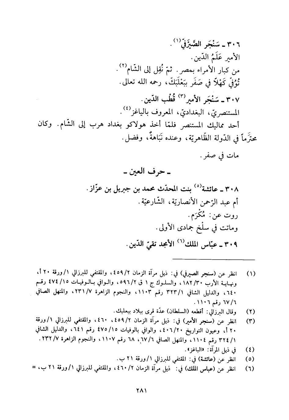 [3] انظر عن (سنجر الأمير) في: ذيل مرآة الزمان 2/ 459، 460، والمقتفي للبرزالي 1/ ورقة 20 أ، وعيون التواريخ 20/ 406، والوافي بالوفيات 15/ 475 رقم 641، والدليل الشافي 1/ 324 رقم 1104، والمنهل الصافي 6/ 67، 68 رقم 1107، والنجوم الزاهرة 7/ 232.