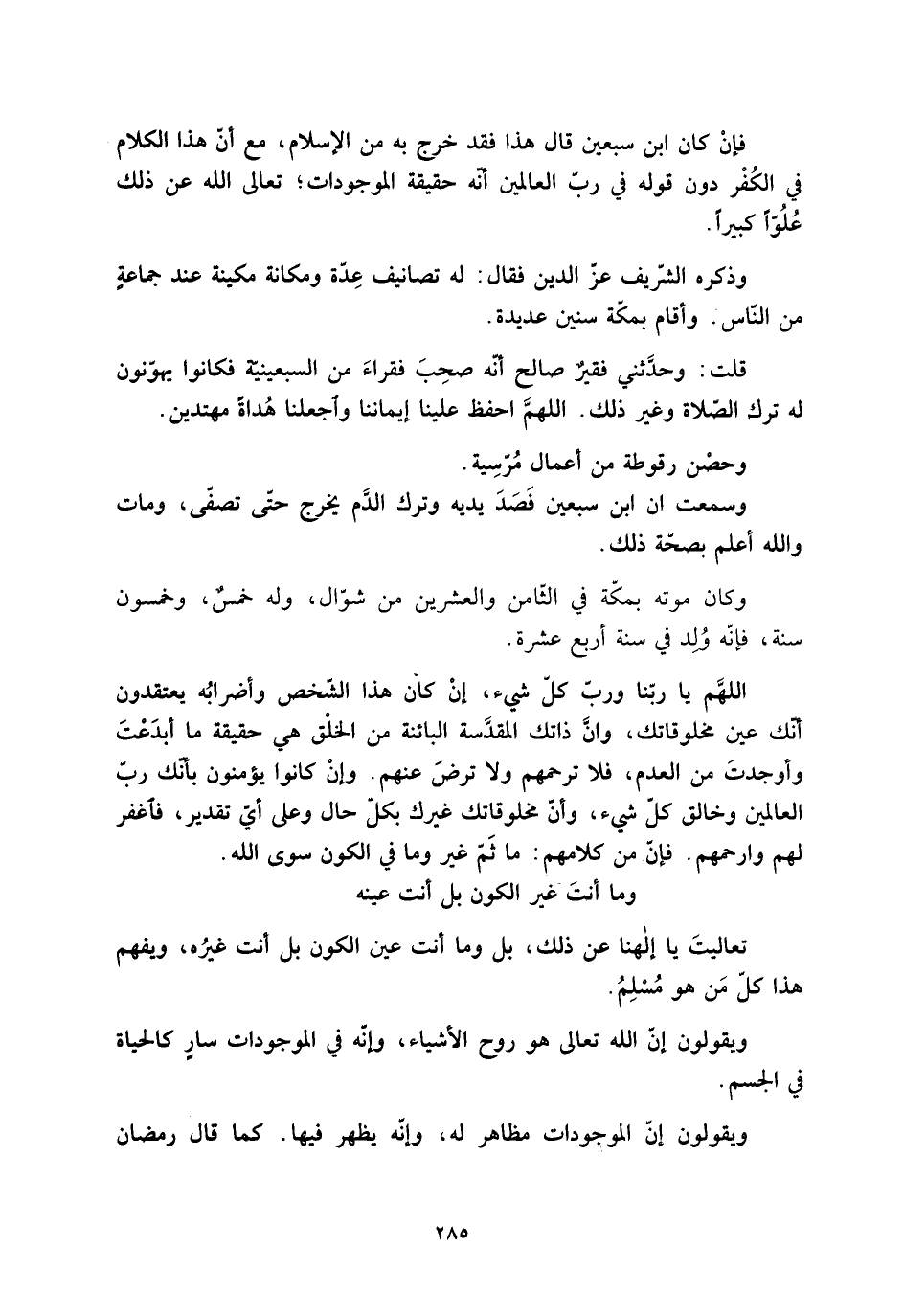 فإنْ كان ابن سبعين قال هذا فقد خرج به من الإسلام، مع أنّ هذا الكلام في الكُفْر دون قوله في ربّ العالمين أنّه حقيقة الموجودات، تعالى الله عن ذلك عُلُوًّا كبيرا.