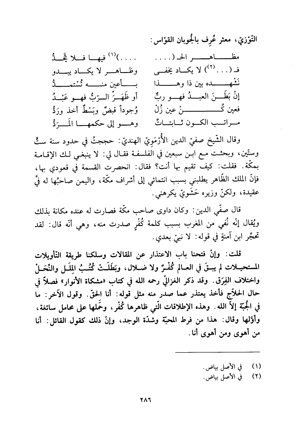 قلت: وإن فتحنا باب الاعتذار عن المقالات وسلكنا طريقة التّأويلات المستحيلات لم يبقَ في العالم كُفْرٌ ولا ضلال، وبَطَلَت كُتُبُ المِلَل والنِّحَل واختلاف الفِرَق. وقد ذكر الغزالي رحمه الله في كتاب «مشكاة الأنوار» فصلا في حال الحلّاج فأخذ يعتذر عما صدر منه مثل قوله: أنا الحقّ. وقول الآخر: ما في الْجُبّة إلّا الله. وهذه الإطلاقات الّتي ظاهرها كُفْر، وحَمَلها على محامل سائغة، وأوّلها وقال: هذا من فرط المحبّة وشدّة الوجد، وإنّ ذلك كقول القائل: أنا من أهوى ومن أهوى أنا.
