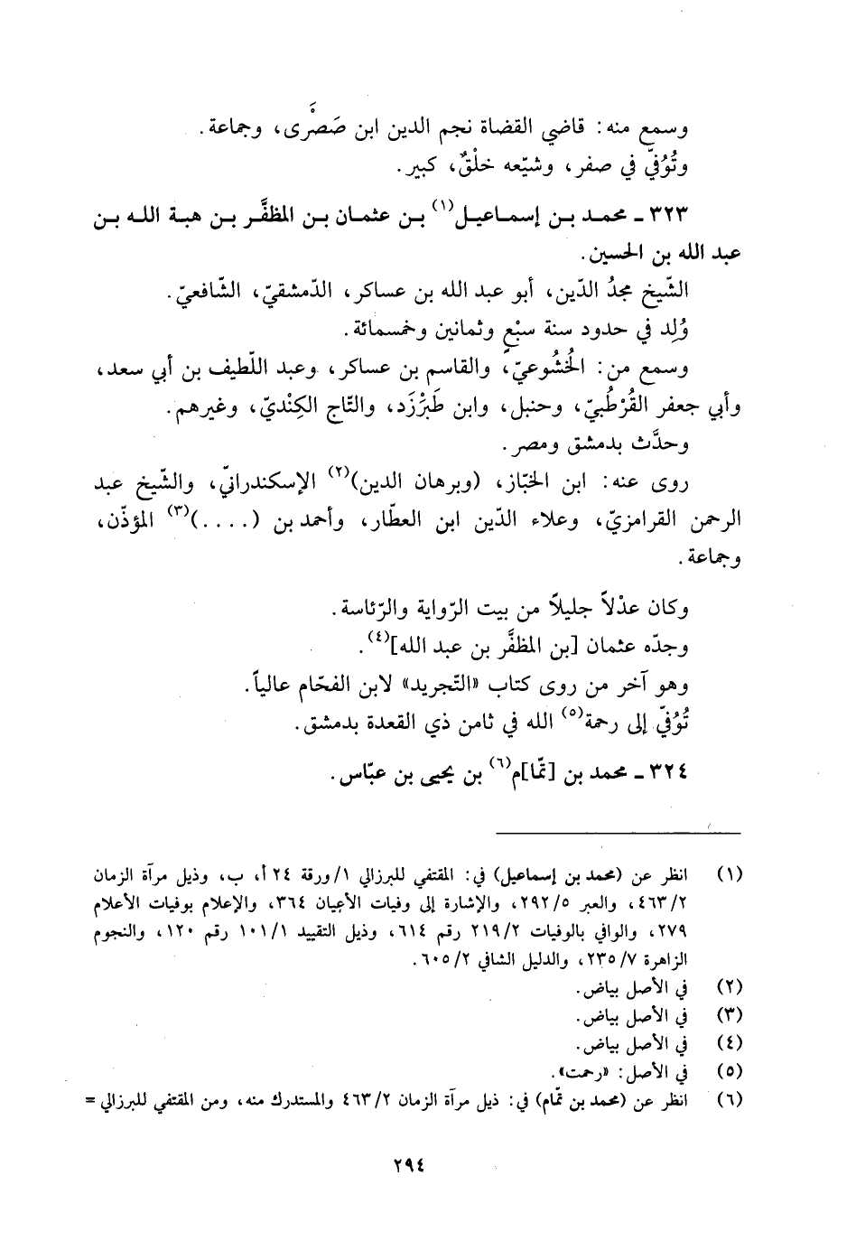 323- محمد بن إسماعيل [1] بن عثمان بن المظفَّر بْن هبة اللَّه بْن عَبْد اللَّهِ بْن الحسين.
