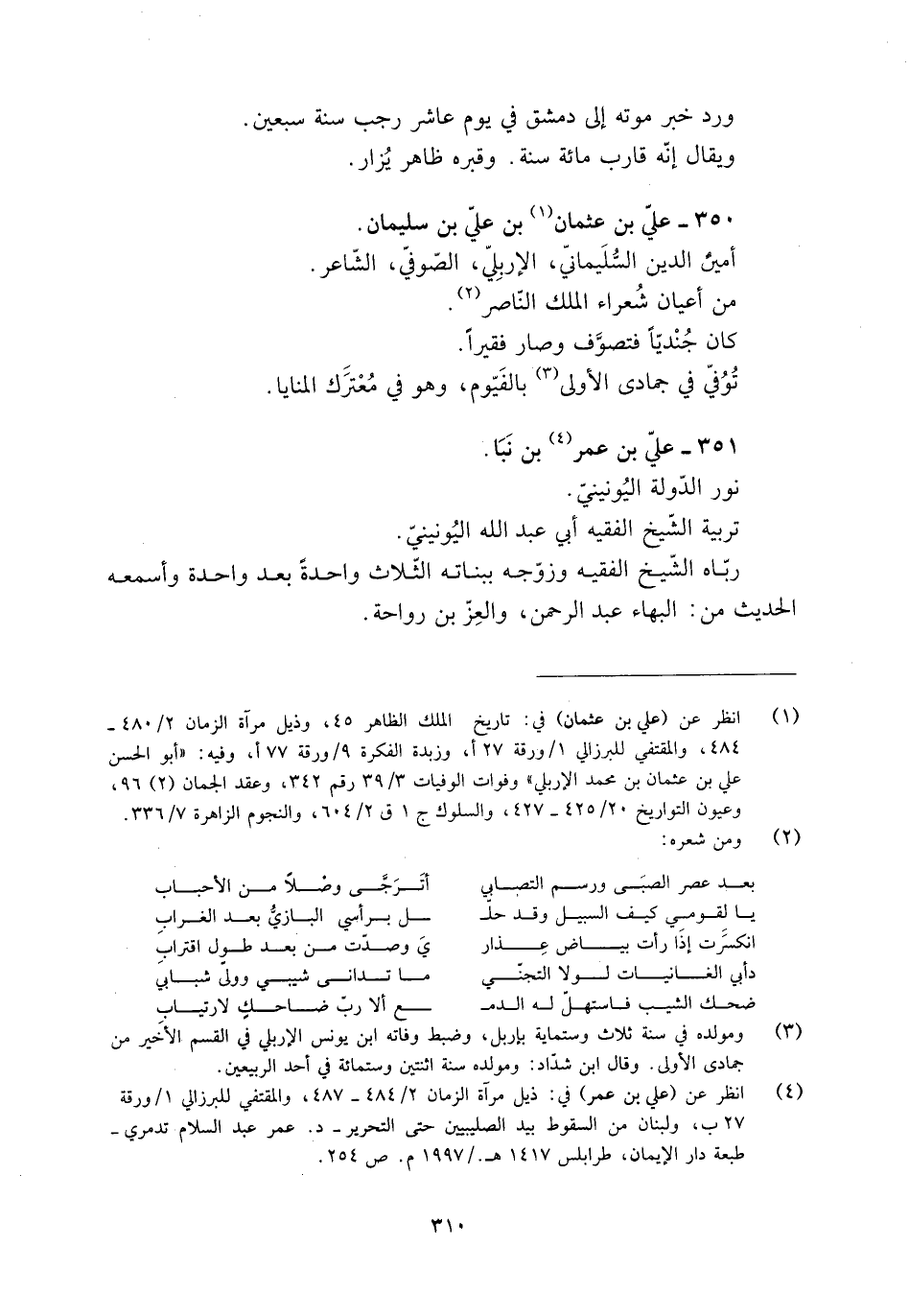 [4] انظر عن (علي بن عمر) في: ذيل مرآة الزمان 2/ 484- 487، والمقتفي للبرزالي 1/ ورقة 27 ب، ولبنان من السقوط بيد الصليبيين حتى التحرير- د. عمر عبد السلام تدمري- طبعة دار الإيمان، طرابلس 1417 هـ. / 1997 م. ص 254.