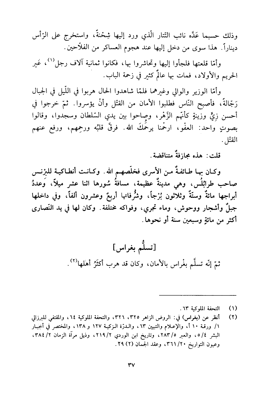 [2] انظر عن (بغراس) في: الروض الزاهر 325، 326، والتحفة الملوكية 64، والمقتفي للبرزالي 1/ ورقة 10 أ، والإعلام والتبيين 63، والدرّة الزكية 127 و 138، والمختصر في أخبار البشر 4/ 5، والعبر 5/ 283، وتاريخ ابن الوردي 2/ 219، وذيل مرآة الزمان 2/ 384، وعيون التواريخ 20/ 361، وعقد الجمان (2) 29.