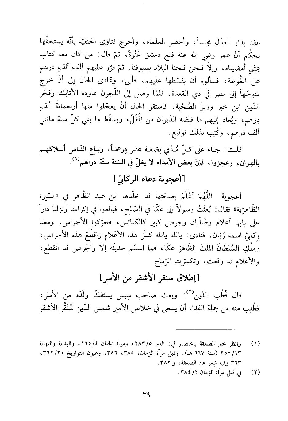 قال قُطْب الدّين [2] : وبعث صاحب سِيس يستفكّ ولَدَه من الأسر، فطُلِب منه من جملة الفِداء أن يسعى في خلاص الأمير شمس الدّين سُنْقُر الأشقر