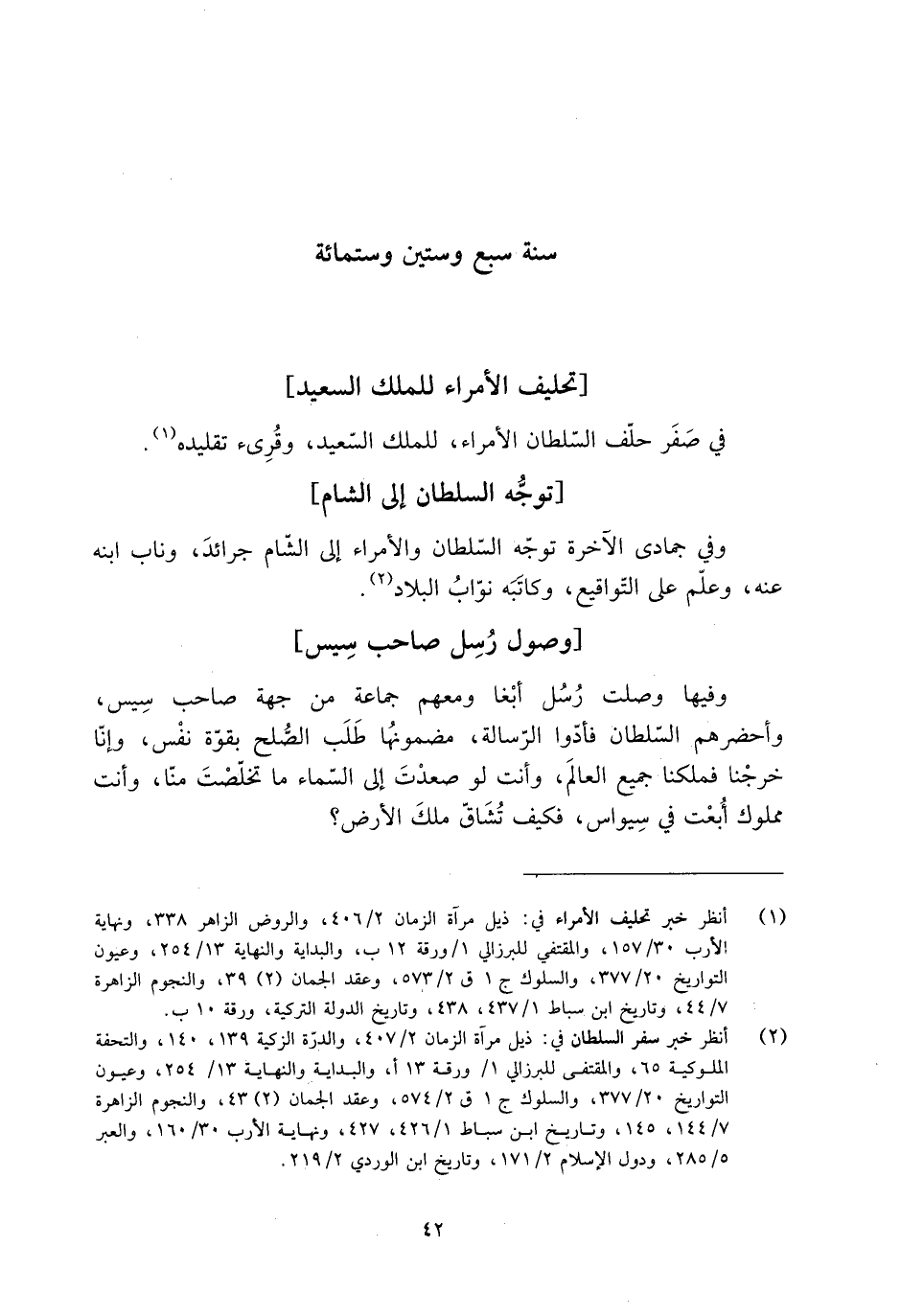 [2] انظر خبر سفر السلطان في: ذيل مرآة الزمان 2/ 407، والدرّة الزكية 139، 140، والتحفة الملوكية 65، والمقتفي للبرزالي 1/ ورقة 13 أ، والبداية والنهاية 13/ 254، وعيون التواريخ 20/ 377، والسلوك ج 1 ق 2/ 574، وعقد الجمان (2) 43، والنجوم الزاهرة 7/ 144، 145، وتاريخ ابن سباط 1/ 426، 427، ونهاية الأرب 30/ 160، والعبر 5/ 285، ودول الإسلام 2/ 171، وتاريخ ابن الوردي 2/ 219.