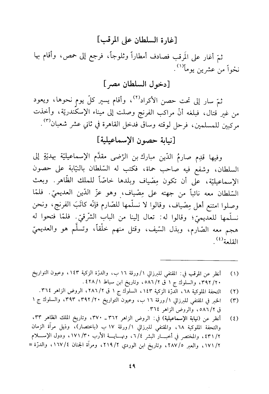 [4] انظر عن (نيابة الإسماعيلية) في: الروض الزاهر 362- 370، وتاريخ الملك الظاهر 33، والتحفة الملوكية 68، والمقتفي للبرزالي 1/ ورقة 17 ب (باختصار) ، وذيل مرآة الزمان 2/ 431، والمختصر في أخبار البشر 4/ 6، ونهاية الأرب 30/ 171، ودول الإسلام 2/ 171، والعبر 5/ 287، وتاريخ ابن الوردي 2/ 219، ومرآة الجنان 4/ 167، والدرّة
