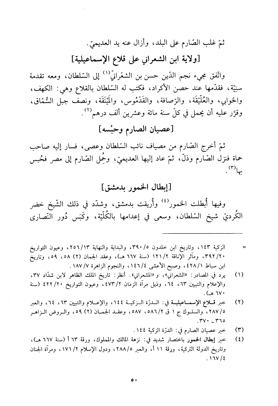 [2] خبر قلاع الإسماعيلية في: الدرّة الزكية 144، والإعلام والتبيين 63، 64، والعبر 5/ 287، والسلوك ج 1 ق 2/ 586، 587، وعقد الجمان (2) 59، والروض الزاهر 365- 370.