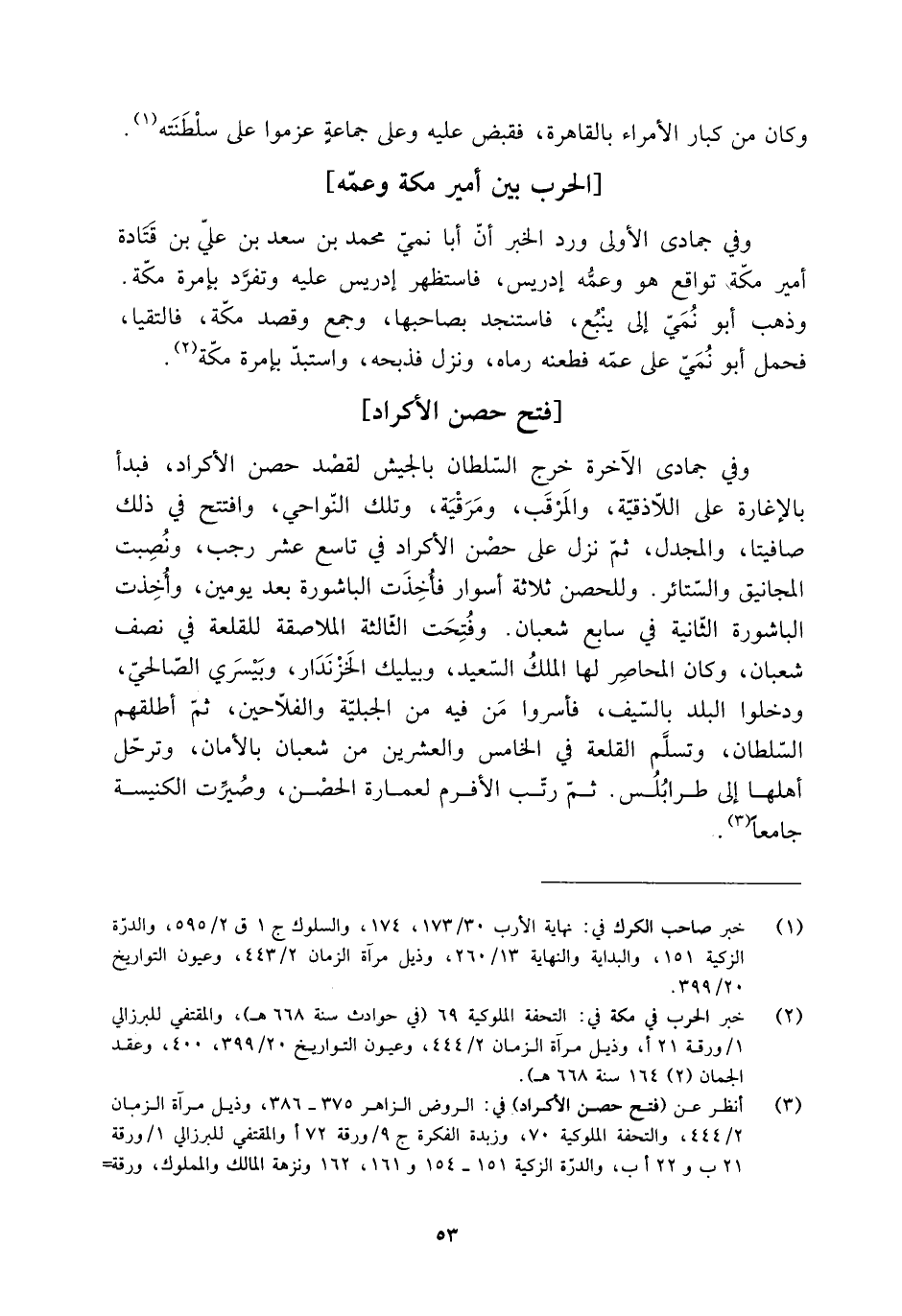 [3] انظر عن (فتح حصن الأكراد) في: الروض الزاهر 375- 376، وذيل مرآة الزمان 2/ 444، والتحفة الملوكية 70، وزبدة الفكرة ج 9/ ورقة 72 أوالمقتفي للبرزالي 1/ ورقة 21 ب و 22 أب، والدرّة الزكية 151- 154 و 161، 162 ونزهة المالك والمملوك، ورقة