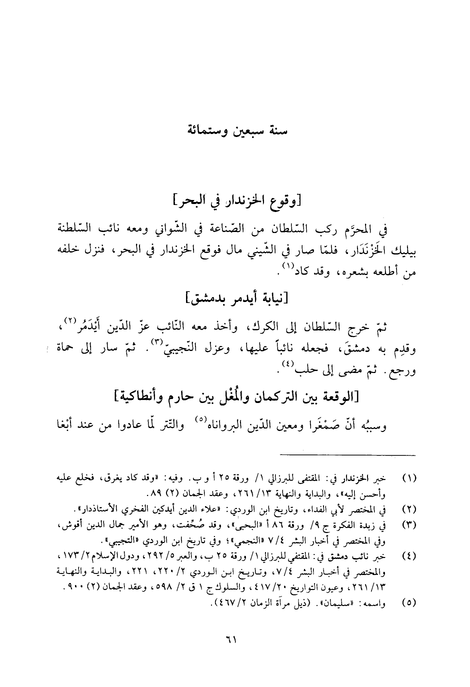 [4] خبر نائب دمشق في: المقتفي للبرزالي 1/ ورقة 25 ب، والعبر 5/ 292، ودول الإسلام 2/ 173، والمختصر في أخبار البشر 4/ 7، وتاريخ ابن الوردي 2/ 220، 221، والبداية والنهاية 13/ 261، وعيون التواريخ 20/ 417، والسلوك ج 1 ق 2/ 598، وعقد الجمان (2) 900.