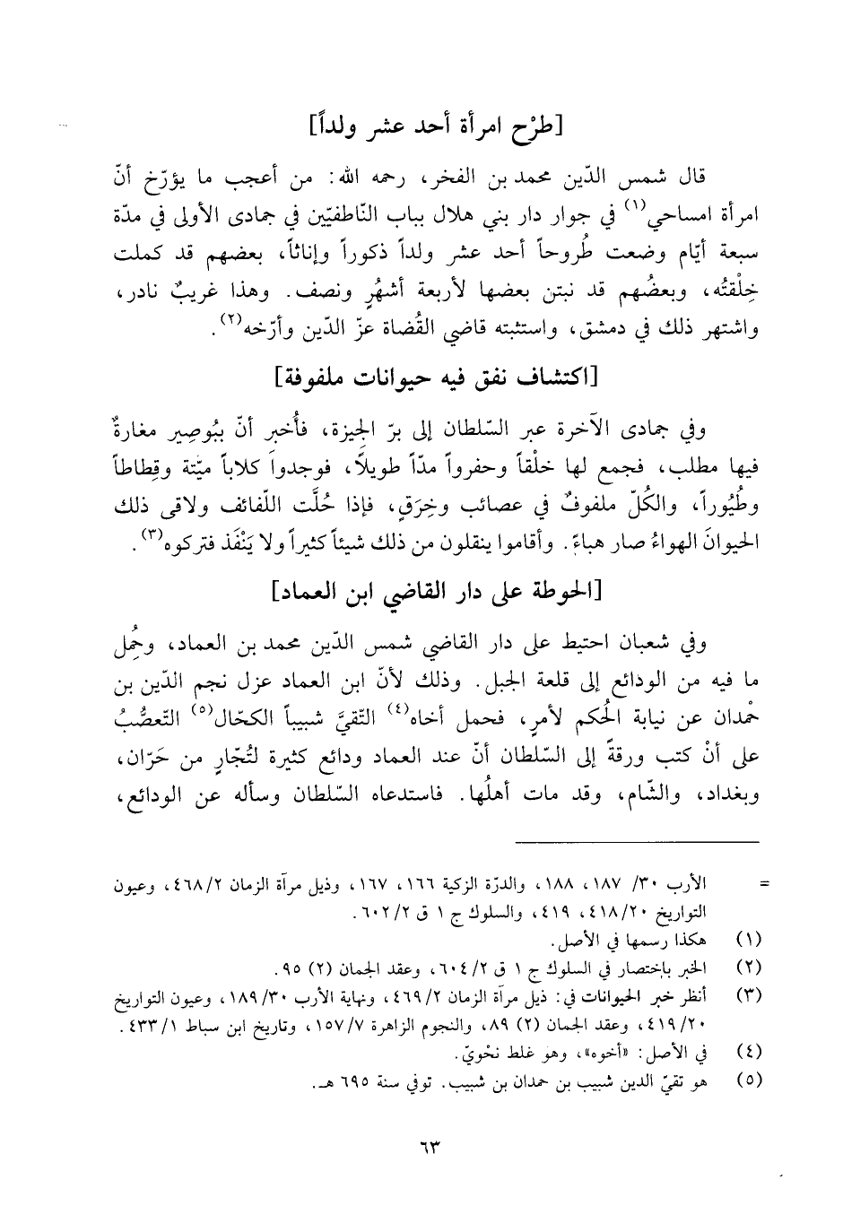 قال شمس الدّين محمد بن الفخر، رحمه الله: من أعجب ما يؤرّخ أنّ امرأة امساحي [1] في جوار دار بني هلال بباب النّاطفيّين في جُمَادى الأولى في مدّة سبعة أيّام وضعت طُروحًا أحد عشر ولدا ذكورا وإناثا، بعضهم قد كملت خلقته، وبعضهم قد نبتن بعضها لأربعة أشهُرٍ ونصف. وهذا غريبٌ نادر، واشتهر ذلك في دمشق، واستثبته قاضي القُضاة عزّ الدّين وأرّخه [2] .