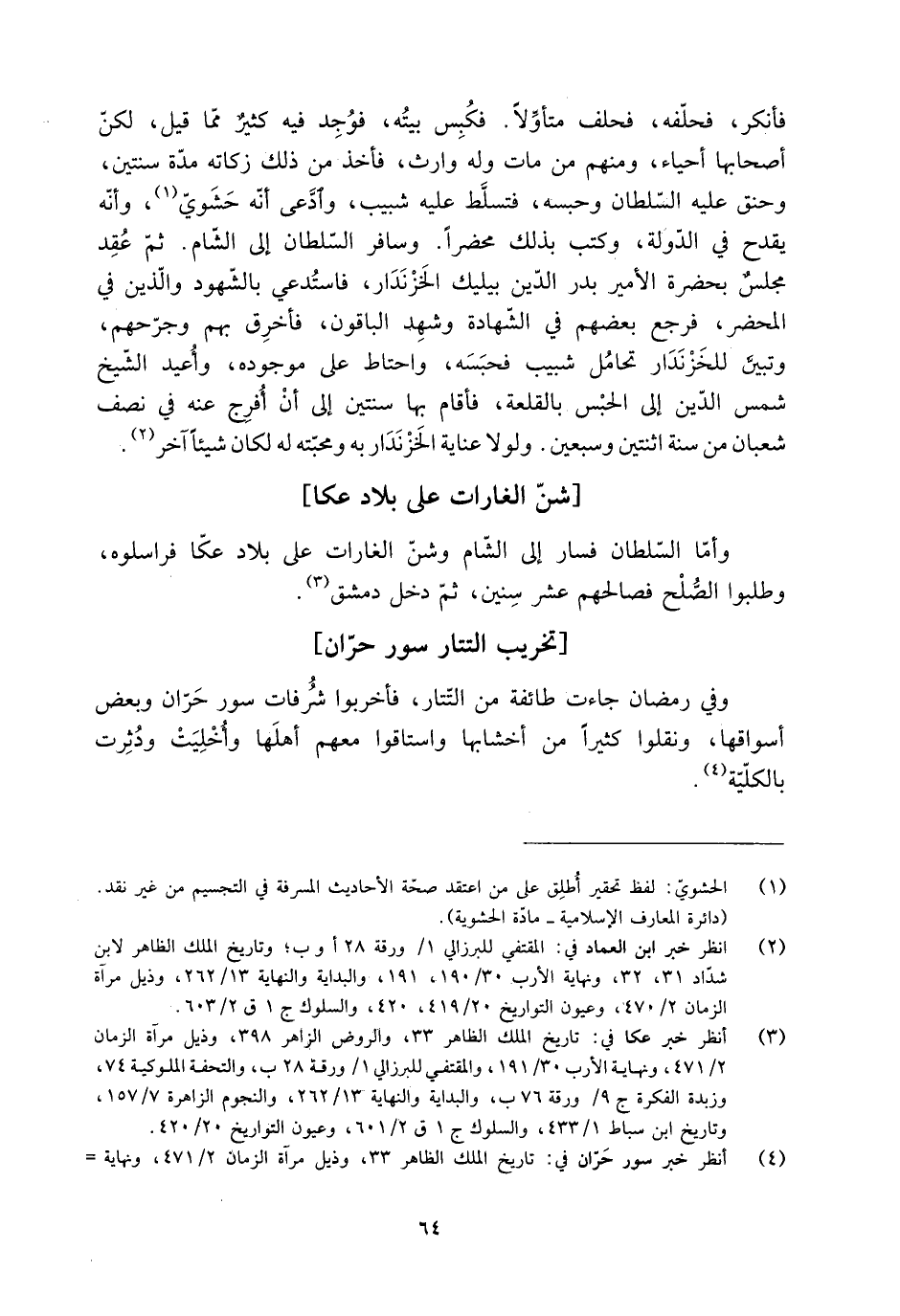 [4] انظر خبر سور حرّان في: تاريخ الملك الظاهر 33، وذيل مرآة الزمان 2/ 471، ونهاية
