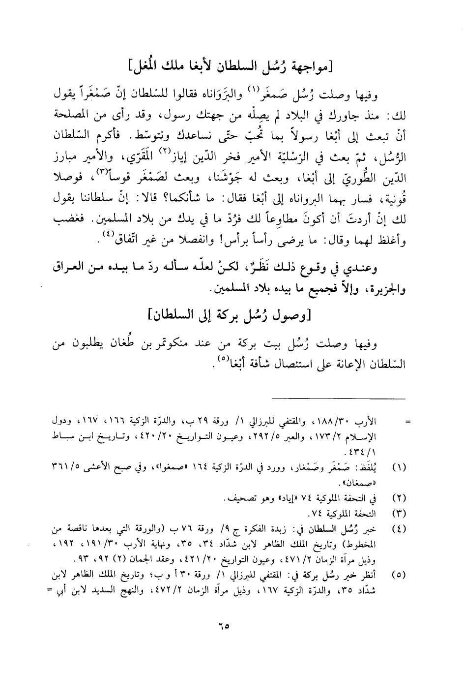 [5] انظر خبر رسل بركة في: المقتفي للبرزالي 1/ ورقة 30 أوب، وتاريخ الملك الظاهر لابن شدّاد 35، والدرّة الزكية 167، وذيل مرآة الزمان 2/ 472، والنهج السديد لابن أبي