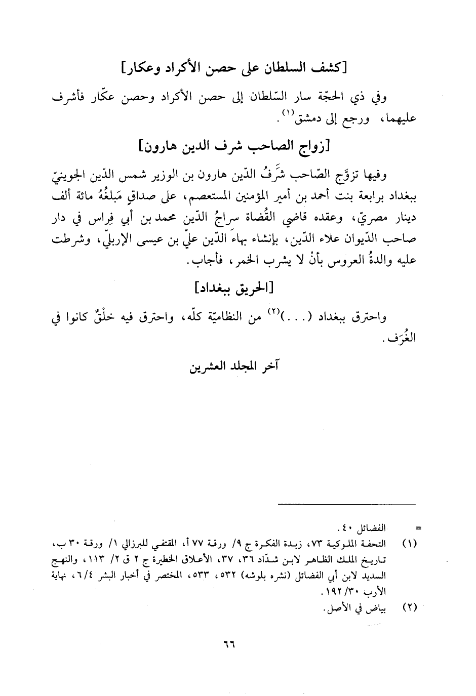 [1] التحفة الملوكية 73، زبدة الفكرة ج 9/ ورقة 77 أ، المقتفي للبرزالي 1/ ورقة 30 ب، تاريخ الملك الظاهر لابن شدّاد 36، 37، الأعلاق الخطيرة ج 2 ق 2/ 113، والنهج السديد لابن أبي الفضائل (نشره بلوشه) 532، 533، المختصر في أخبار البشر 4/ 6، نهاية الأرب 30/ 192.