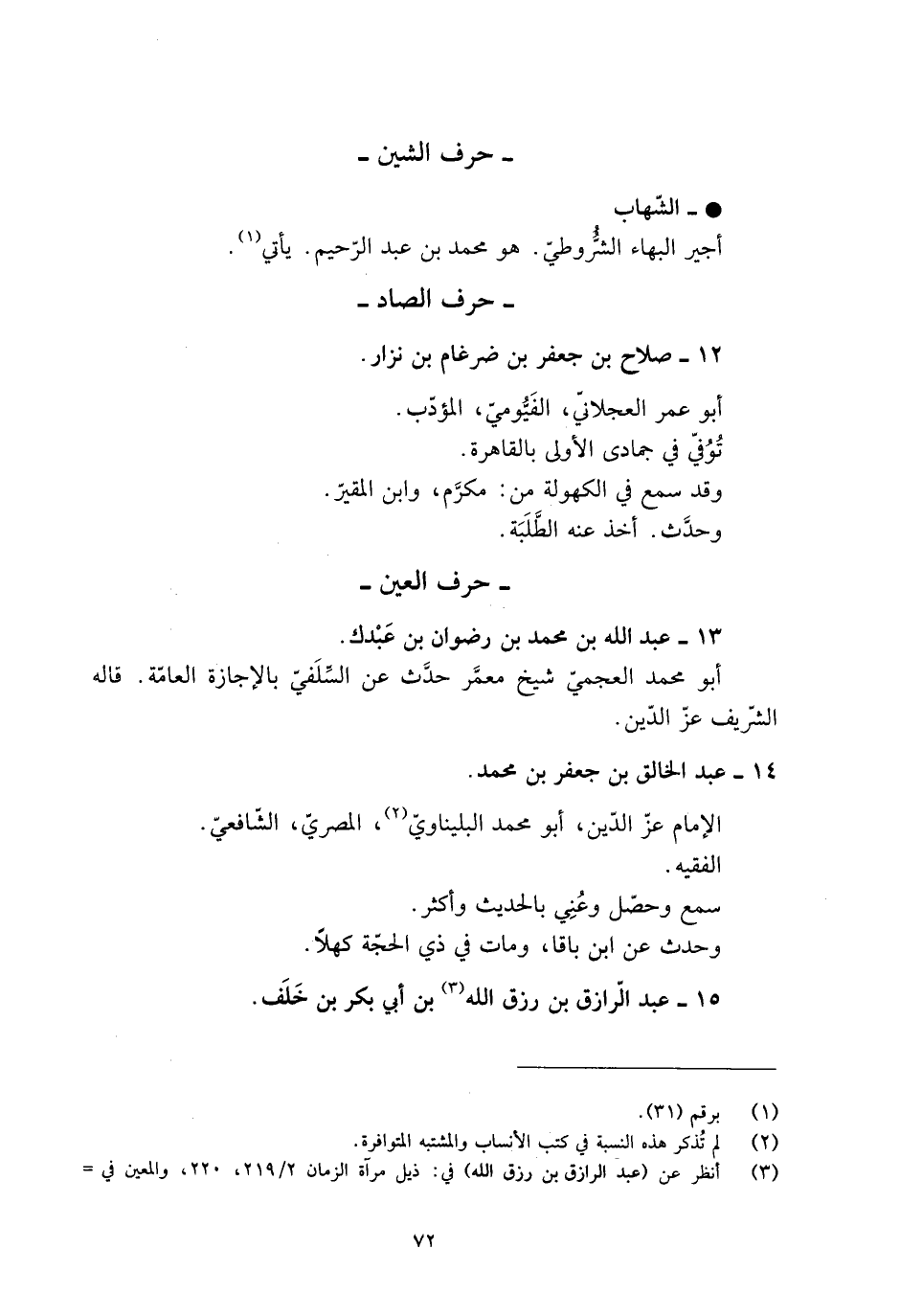 [3] انظر عن (عبد الرزاق بن رزق الله) في: ذيل مرآة الزمان 2/ 219، 220، والمعين في