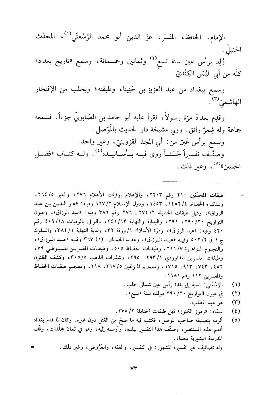 [ () ] طبقات المحدّثين 210 رقم 2203، والإعلام بوفيات الأعلام 276، والعبر 5/ 264، وتذكرة الحفاظ 4/ 1452، 1453، ودول الإسلام 2/ 167 وفيه: «عز الدين بن عبد الرزاق» ، وذيل طبقات الحنابلة 2/ 274- 276 رقم 386 وفيه: «عبد الرزاق» ، وعيون التواريخ 20/ 290، 291، والبداية والنهاية 13/ 241، والوافي بالوفيات 18/ 409 رقم 420 وفيه: «عبد الرزاق» ، ودرّة الأسلاك 1/ ورقة 32، وغاية النهاية 1/ 384، والسلوك ج 1 ق 2/ 502 وفيه «عبد الرزاق» ، وعقد الجمان. (1) 367 وفيه «عبد الرزاق» ، والنجوم الزاهرة 7/ 211، وطبقات الحفاظ 505، وطبقات المفسرين للسيوطي 79، وطبقات المفسرين للداوديّ 1/ 293- 295، وشذرات الذهب 5/ 305، وكشف الظنون 452، 743، 913، 1715، ومعجم المؤلفين 5/ 217، 218، ومعجم طبقات الحفاظ والمفسرين 112 رقم 1181.