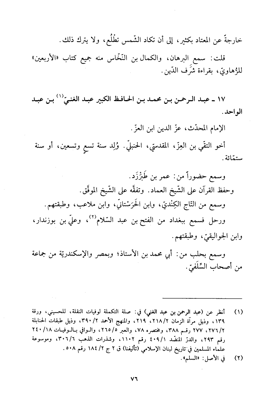 [1] انظر عن (عبد الرحمن بن عبد الغني) في: صلة التكملة لوفيات النقلة، للحسيني، ورقة 139، وذيل مرآة الزمان 2/ 218، 219، والمنهج الأحمد 2/ 390، وذيل طبقات الحنابلة 2/ 276، 277 رقم 388، ومختصره 78، والعبر 5/ 265، والوافي بالوفيات 18/ 240 رقم 293، والدرّ النّضد 1/ 409 رقم 1102، وشذرات الذهب 6/ 306، وموسوعة علماء المسلمين في تاريخ لبنان الإسلامي (تأليفنا) ق 2 ج 2/ 184 رقم 508.