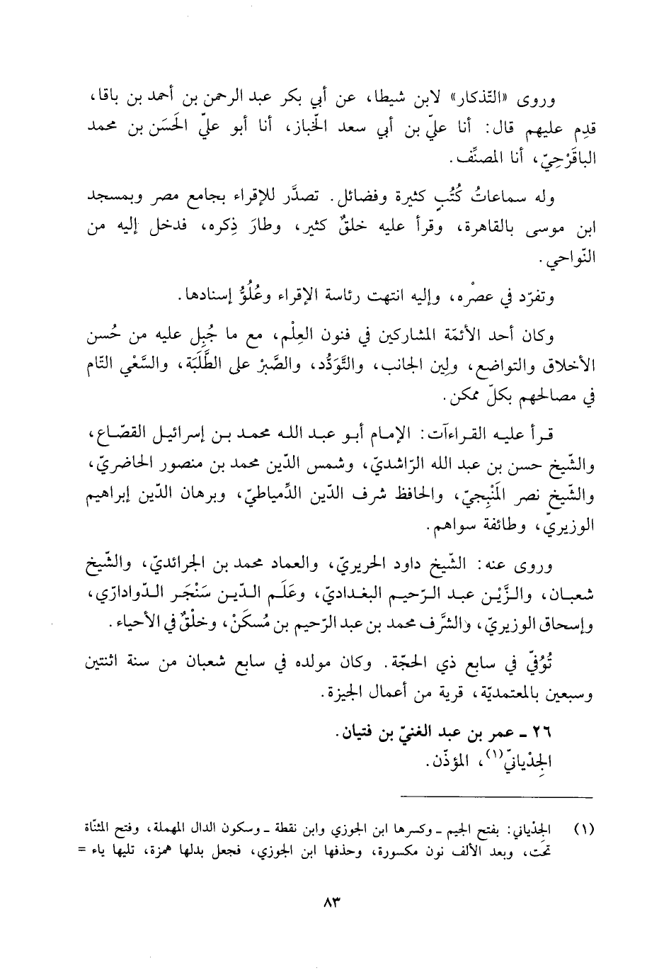 وروى «التّذكار» لابن شِيطا، عن أَبِي بَكْر عَبْد الرَّحْمَن بْن أَحْمَد بن باقا، قدِم عليهم قال: أنا عليّ بن أبي سعد الخبّاز، أنا أبو عليّ الحَسَن بن محمد الباقَرْحِيّ، أنا المصنِّف.