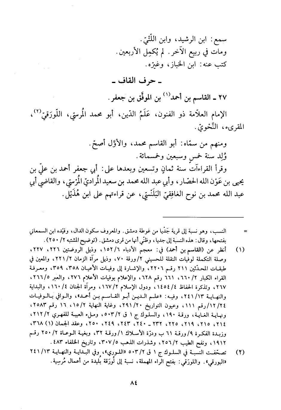 [2] تصحّفت النسبة في السلوك ج 1 ق 2/ 503 «اللوري» ، وفي البداية والنهاية 13/ 241 «البورقي» . واللورقي: بفتح الراء المهملة، نسبة إلى لورقة بليدة من أعمال مرسية.