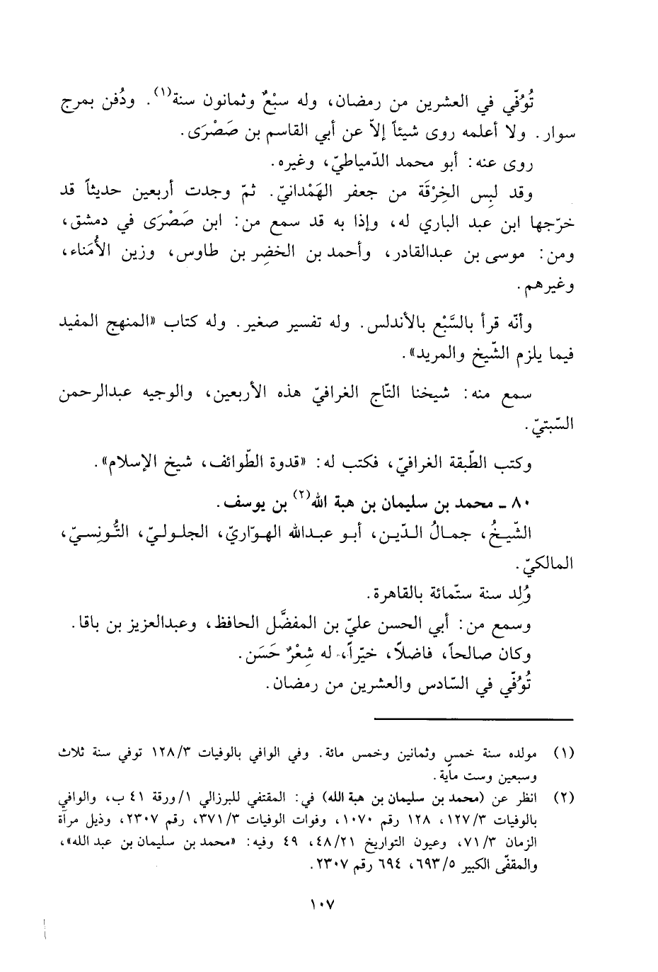 [2] انظر عن (محمد بن سليمان بن هبة الله) في: المقتفي للبرزالي 1/ ورقة 41 ب، والوافي بالوفيات 3/ 127، 128 رقم 1070، وفوات الوفيات 3/ 371، رقم 2307، وذيل مرآة الزمان 3/ 71، وعيون التواريخ 21/ 48، 49 وفيه: «محمد بن سليمان بن عبد الله» ، والمقفّى الكبير 5/ 693، 694 رقم 2307.