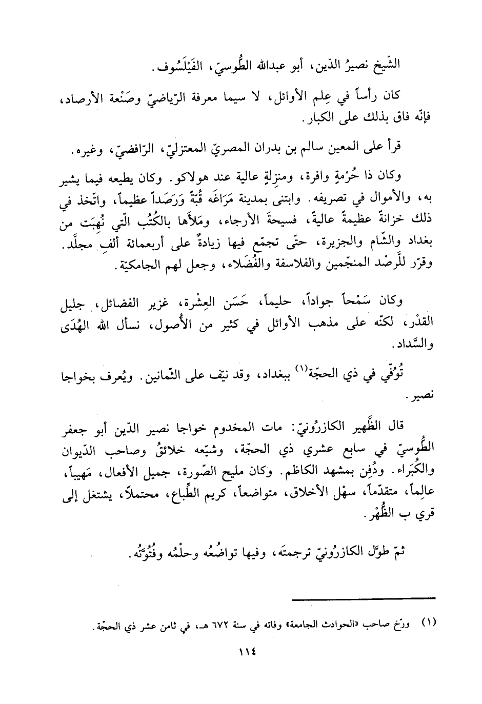 قَالَ الظَّهير الكازرُونيّ: مات المخدوم خواجا نصير الدّين أبو جَعْفَر الطُّوسيّ فِي سابع عشري ذي الحجّة، وشيّعه خلائقُ وصاحب الدّيوان والكُبَراء. ودُفِن بمشهد الكاظم. وكان مليح الصّورة، جميل الأفعال، مَهيبًا، عالِمًا، متقدّما، سهْل الأخلاق، متواضعا، كريم الطِّباع، محتملا، يشتغل إِلَى قري ب الظُّهْر.