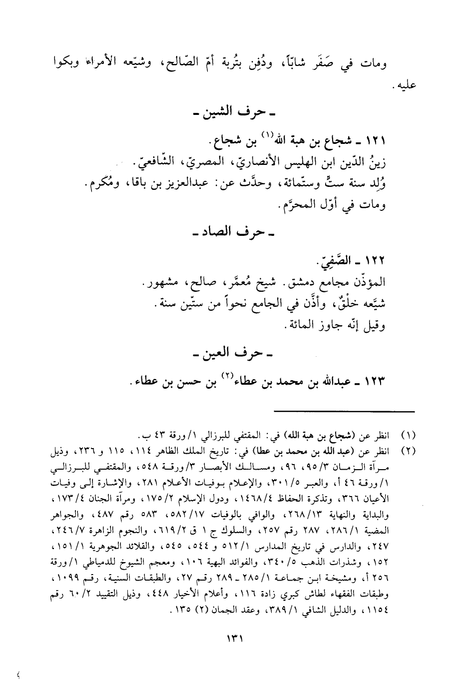 [2] انظر عن (عبد الله بن محمد بن عطا) في: تاريخ الملك الظاهر 114، 115 و 236، وذيل مرآة الزمان 3/ 95، 96، ومسالك الأبصار 3/ ورقة 548، والمقتفي للبرزالي 1/ ورقة 46 أ، والعبر 5/ 301، والإعلام بوفيات الأعلام 281، والإشارة إلى وفيات الأعيان 366، وتذكرة الحفاظ 4/ 1468، ودول الإسلام 2/ 175، ومرآة الجنان 4/ 173، والبداية والنهاية 13/ 268، والوافي بالوفيات 17/ 582، 583 رقم 487، والجواهر المضية 1/ 286، 287 رقم 257، والسلوك ج 1 ق 2/ 619، والنجوم الزاهرة 7/ 246، 247، والدارس في تاريخ المدارس 1/ 512 و 544، 545، والقلائد الجوهرية 1/ 151، 152، وشذرات الذهب 5/ 340، والفوائد البهية 106، ومعجم الشيوخ للدمياطي 1/ ورقة 256 أ، ومشيخة ابن جماعة 1/ 285- 289 رقم 27، والطبقات السنية، رقم 1099، وطبقات الفقهاء لطاش كبرى زاده 116، وأعلام الأخيار 448، وذيل التقييد 2/ 60 رقم 1154، والدليل الشافي 1/ 389، وعقد الجمان (2) 135.