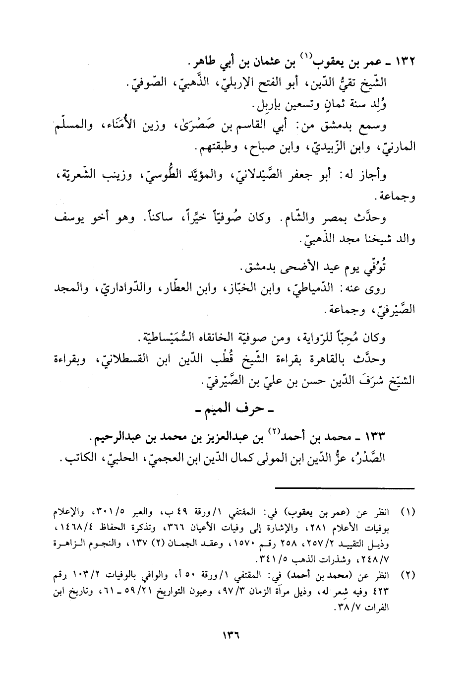 [1] انظر عن (عمر بن يعقوب) في: المقتفي 1/ ورقة 49 ب، والعبر 5/ 301، والإعلام بوفيات الأعلام 281، والإشارة إلى وفيات الأعيان 366، وتذكرة الحفاظ 4/ 1468، وذيل التقييد 2/ 257، 258 رقم 1570، وعقد الجمان (2) 137، والنجوم الزاهرة 7/ 248، وشذرات الذهب 5/ 341.