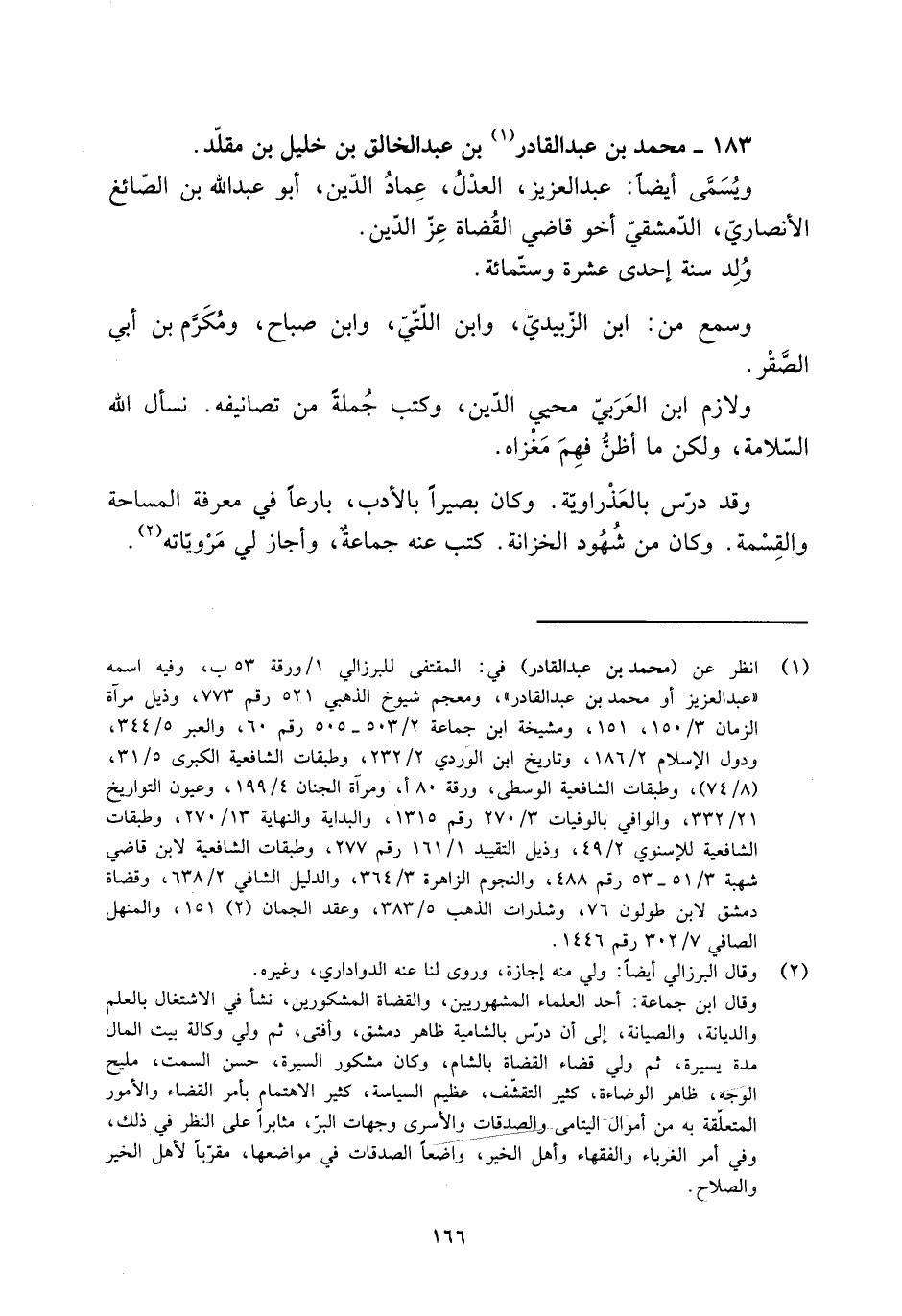 183- مُحَمَّد بْن عَبْد القادر [1] بْن عَبْد الخالق بْن خليل بْن مقلّد.
