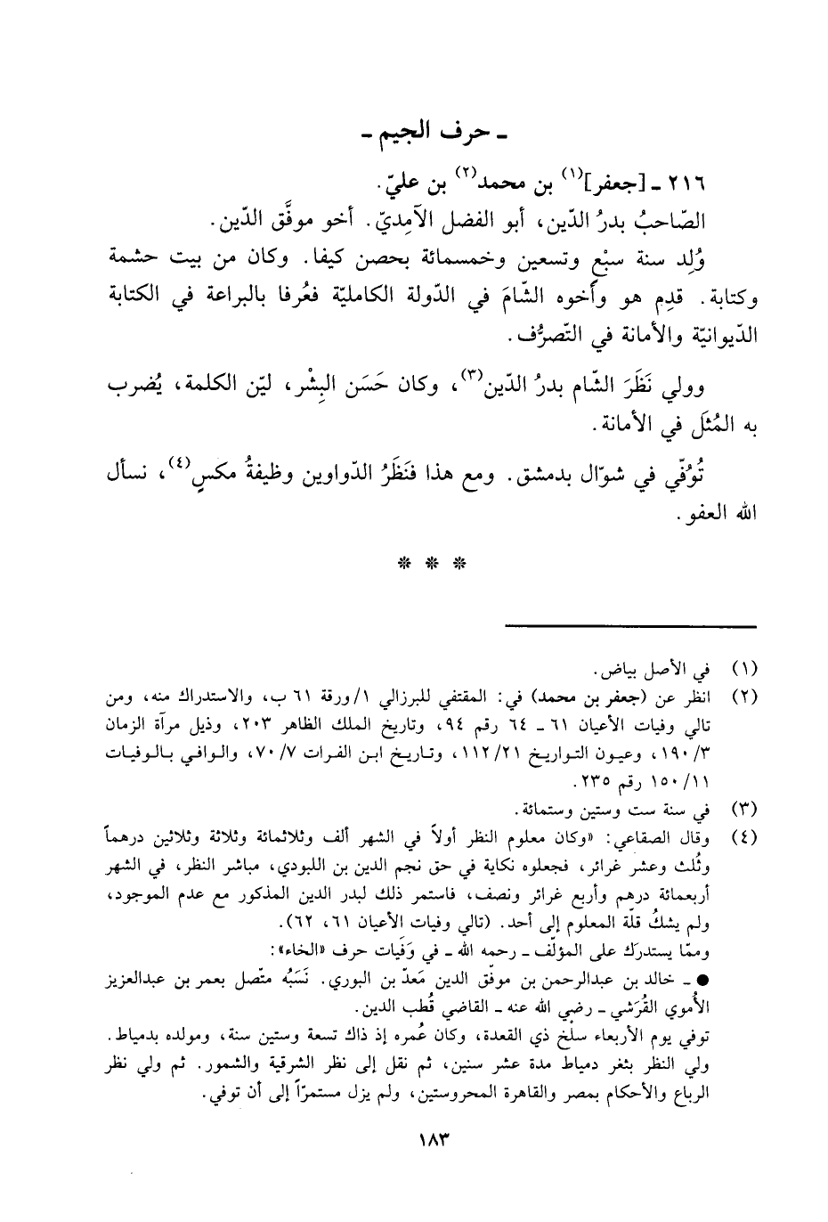 [2] انظر عن (جعفر بن محمد) في: المقتفي للبرزالي 1/ ورقة 61 ب، والاستدراك منه، ومن تالي وفيات الأعيان 61- 64 رقم 94، وتاريخ الملك الظاهر 203، وذيل مرآة الزمان 3/ 190، وعيون التواريخ 21/ 112، وتاريخ ابن الفرات 7/ 70، والوافي بالوفيات 11/ 150 رقم 235.