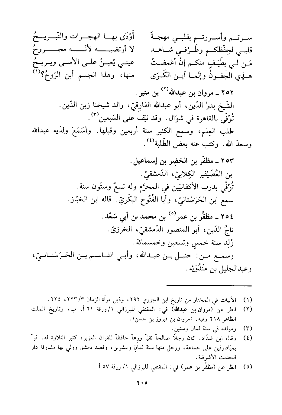 [2] انظر عن (مروان بن عبد الله) في: المقتفي للبرزالي 1/ ورقة 61 أ، ب، وتاريخ الملك الظاهر 218 وفيه: «مروان بن فيروز بن حسن» .