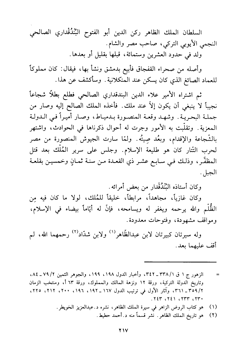 [1] هو كتاب الروض الزاهر في سيرة الملك الظاهر، نشره د. عبد العزيز الخويطر.