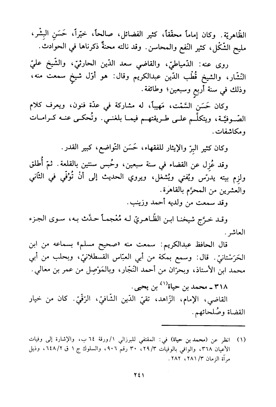 [1] انظر عن (محمد بن حياة) في: المقتفي للبرزالي 1/ ورقة 64 ب، والإشارة إلى وفيات الأعيان 368، والوافي بالوفيات 3/ 29، 30 رقم 906، والسلوك ج 1 ق 2/ 648، وذيل مرآة الزمان 3/ 281، 282.