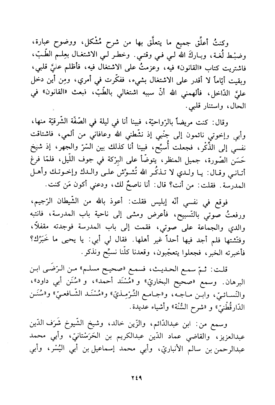 وكنتُ أعلِّق جميع ما يتعلَّق بها من شرح مُشْكل، ووضوح عبارة، وضبْط لُغة، وباركَ الله لي فِي وقتي. وخطر لي الاشتغال بعِلم الطّبّ، فاشتريت كتاب «القانون» فِيهِ، وعزمتُ على الاشتغال فِيهِ، فأظلم عليَّ قلبي، وبقيت أيّاما لا أقدر على الاشتغال بشيء، ففكّرت فِي أمري، ومِن أَيْنَ دخل عليَّ الدّاخل، فألهمني الله أنّ سببه اشتغالي بالطّبّ، فبعث «القانون» فِي الحال، واستنار قلبي.