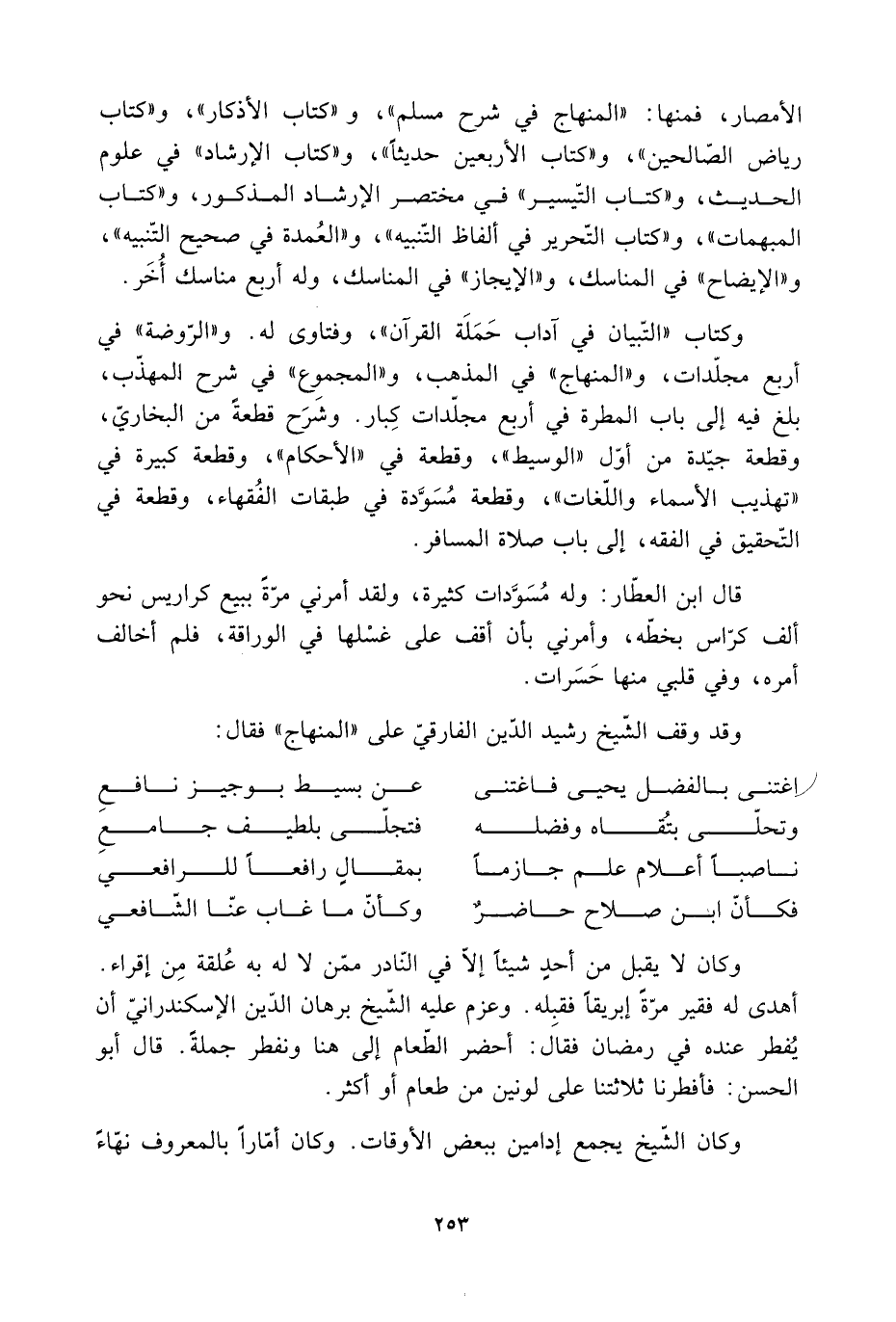 الأمصار، فمنها: «المنهاج في شرح مسلم» ، و «كتاب الأذكار» ، و «كتاب رياض الصّالحين» ، و «كتاب الأربعين حديثا» ، و «كتاب الإرشاد» في علوم الحديث، و «كتاب التّيسير» في مختصر الإرشاد المذكور، و «كتاب المبهمات» ، و «كتاب التّحرير في ألفاظ التّنبيه» ، و «العمدة في صحيح التّنبيه» ، و «الإيضاح» في المناسك، و «الإيجاز» فِي المناسك، وله أربع مناسك أُخَر.