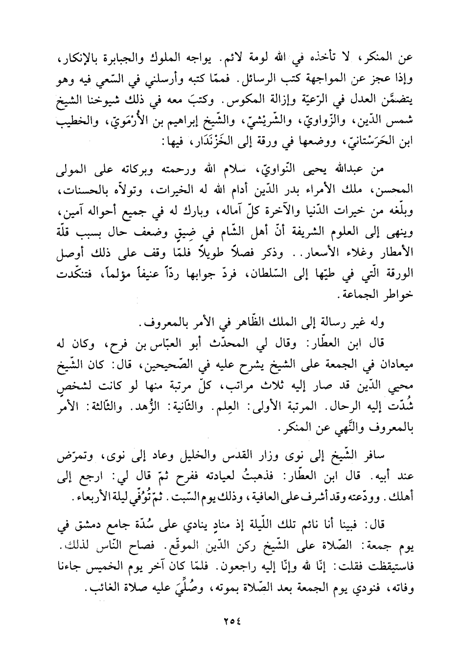 من عَبْد الله يحيى النّواويّ، سلام الله ورحمته وبركاته على المولى المحسن، ملك الأمراء بدْر الدّين أدام الله له الخيرات، وتولّاه بالحسنات، وبلّغه من خيرات الدُّنيا والآخرة كلّ آماله، وبارك له فِي جميع أحواله آمين، وينهى إِلَى العلوم الشريفة أنّ أَهْل الشّام فِي ضيقٍ وضعف حال بسبب قلّة الأمطار وغلاء الأسعار.. وذكر فصلا طويلا فلمّا وقف على ذلك أوصل الورقة الّتي فِي طيّها إِلَى السّلطان، فردّ جوابها ردّا عنيفا مؤلما، فتنكّدت خواطر الجماعة.