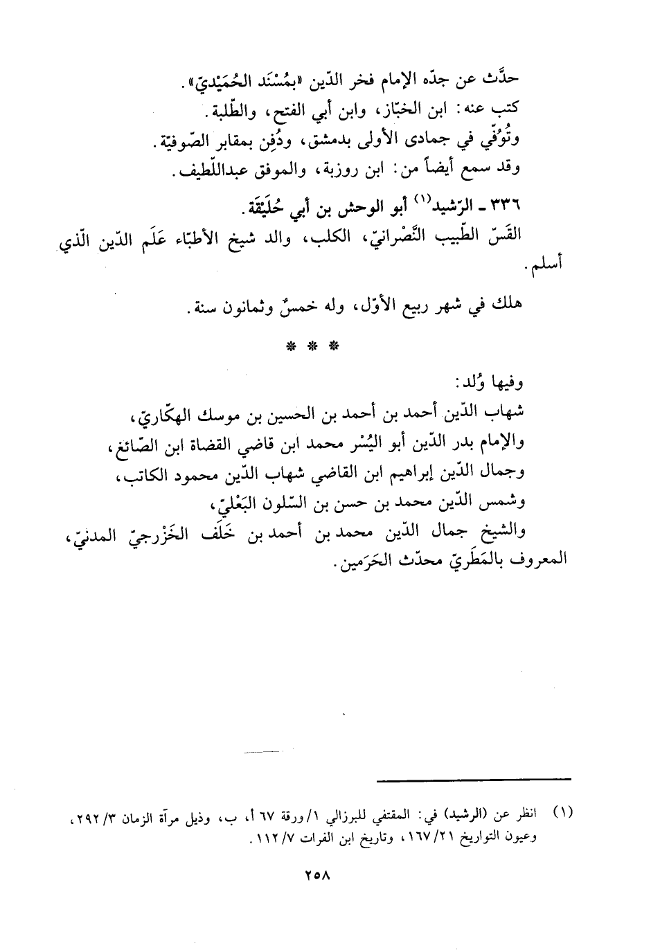 [1] انظر عن (الرشيد) في: المقتفي للبرزالي 1/ ورقة 67 أ، ب، وذيل مرآة الزمان 3/ 292، وعيون التواريخ 21/ 167، وتاريخ ابن الفرات 7/ 112.