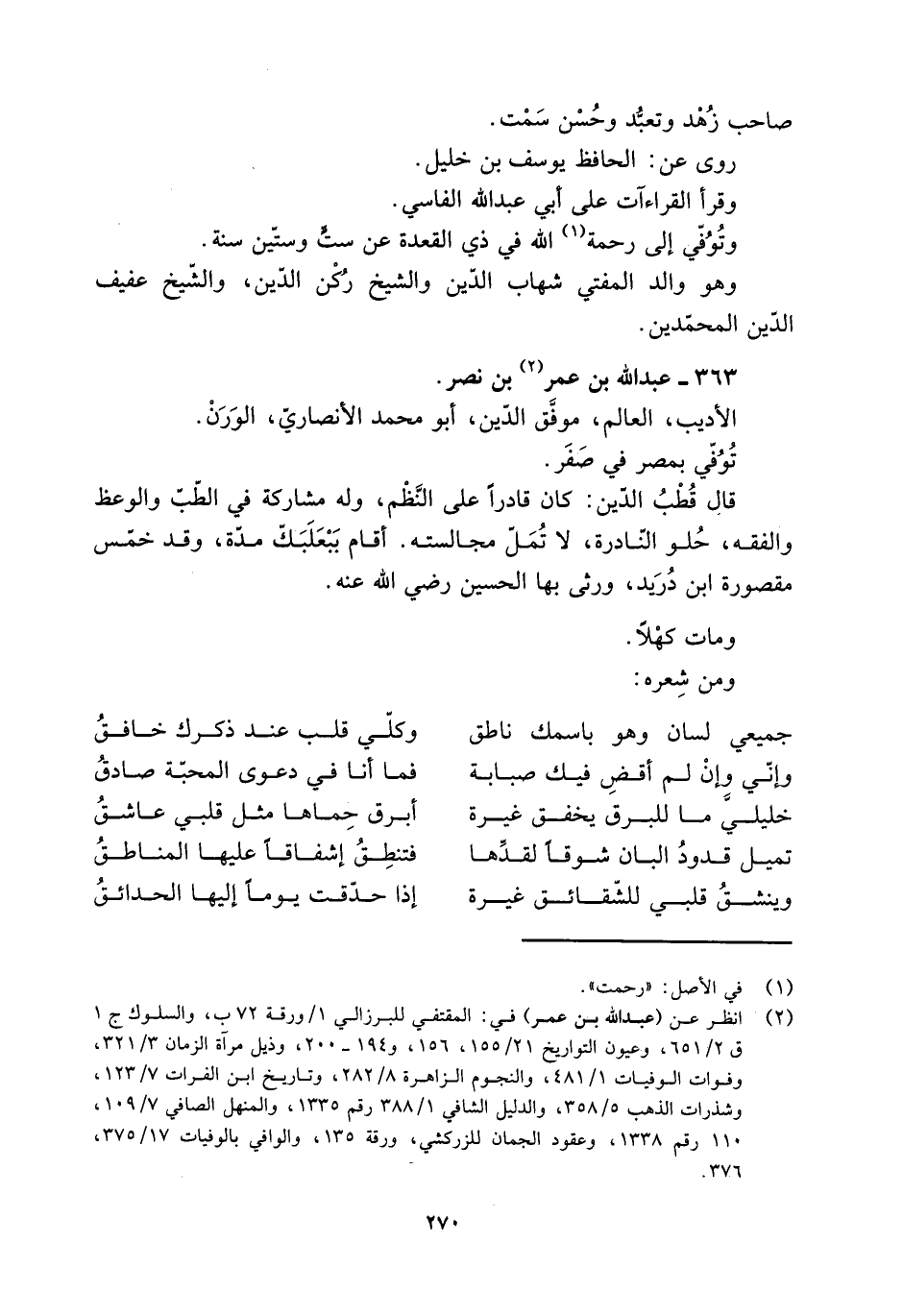 [2] انظر عن (عبد الله بن عمر) في: المقتفي للبرزالي 1/ ورقة 72 ب، والسلوك ج 1 ق 2/ 651، وعيون التواريخ 21/ 155، 156، و 194- 200، وذيل مرآة الزمان 3/ 321، وفوات الوفيات 1/ 481، والنجوم الزاهرة 8/ 282، وتاريخ ابن الفرات 7/ 123، وشذرات الذهب 5/ 358، والدليل الشافي 1/ 388 رقم 1335، والمنهل الصافي 7/ 109، 110 رقم 1338، وعقود الجمان للزركشي، ورقة 135، والوافي بالوفيات 17/ 375، 376.