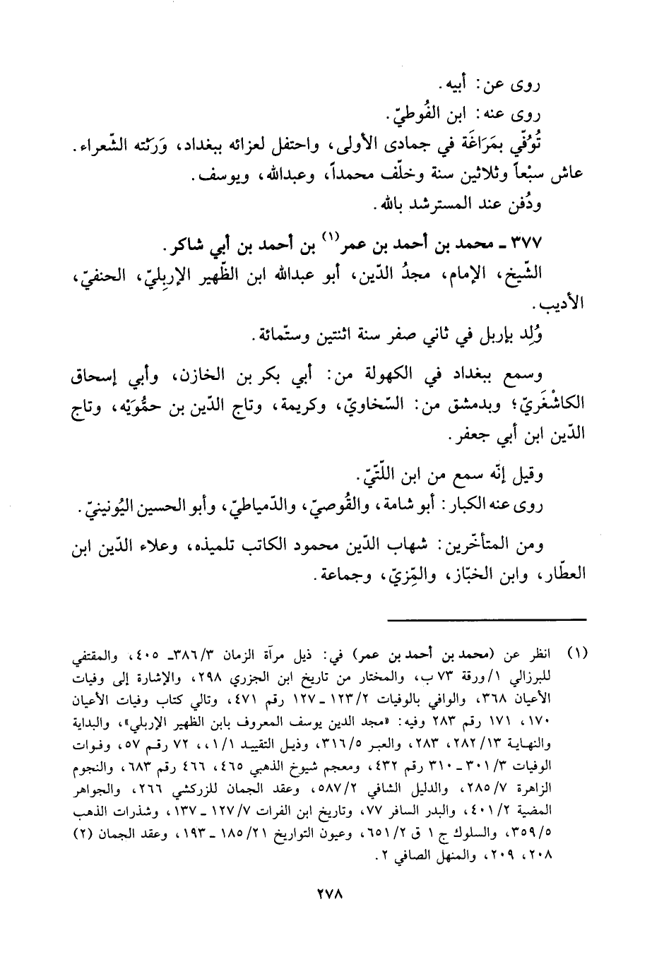 [1] انظر عن (محمد بن أحمد بن عمر) في: ذيل مرآة الزمان 3/ 386- 405، والمقتفي للبرزالي 1/ ورقة 73 ب، والمختار من تاريخ ابن الجزري 298، والإشارة إلى وفيات الأعيان 368، والوافي بالوفيات 2/ 123- 127 رقم 471، وتالي كتاب وفيات الأعيان 170، 171 رقم 283 وفيه: «مجد الدين يوسف المعروف بابن الظهير الإربلي» ، والبداية والنهاية 13/ 282، 283، والعبر 5/ 316، وذيل التقييد 1/ 1، 72 رقم 57، وفوات الوفيات 3/ 301- 310 رقم 432، ومعجم شيوخ الذهبي 465، 466 رقم 683، والنجوم الزاهرة 7/ 285، والدليل الشافي 2/ 587، وعقد الجمان للزركشي 266، والجواهر المضية 2/ 401، والبدر السافر 77، وتاريخ ابن الفرات 7/ 127- 137، وشذرات الذهب 5/ 359، والسلوك ج 1 ق 2/ 651، وعيون التواريخ 21/ 185- 193، وعقد الجمان (2) 208، 209، والمنهل الصافي 2.